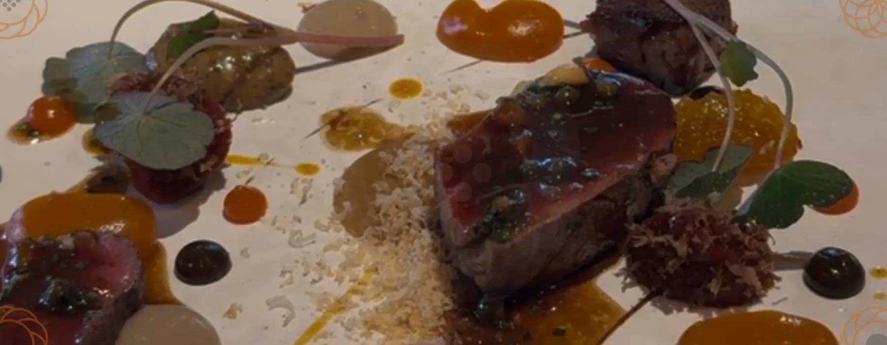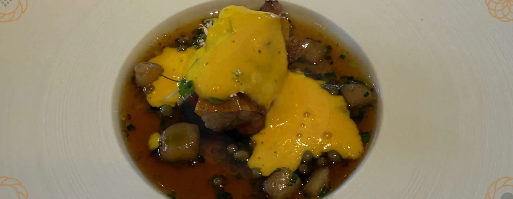 - Limousin Veal Sweetbread: Havuç kumu, vadouvan, sansho biberi, tütsülenmiş kemik iliği. Tatlı böbreğin zenginliği, vadouvan baharatının sıcak tatlarıyla birleşiyor. Sansho biberinin dilde bıraktığı uyuşma hissi, lezzet süresini uzatıyor. Bu tabak, iç organ etini zarif bir biçimde yeniden tanımlıyor — teknik ve duyusal bütünlük içinde.