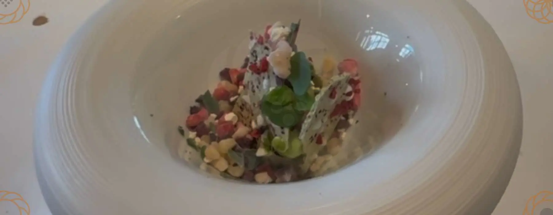 - Wild Sea Bass: Giroll mantarı, gooseberry, komatsuna, isli midye, N25 Kaluga havyar. Deniz levreği sade pişirilmiş; mantarın toprak kokusu, havyarın tuzlu-yağlı karakteriyle dengeleniyor. Bazı tabaklarda eksik hissedilen “vuruş” burada bilerek bastırılmış — Graham’ın ölçülülük felsefesi net. Bu tabak, duygusal sadeliğin en güçlü örneklerinden biri.