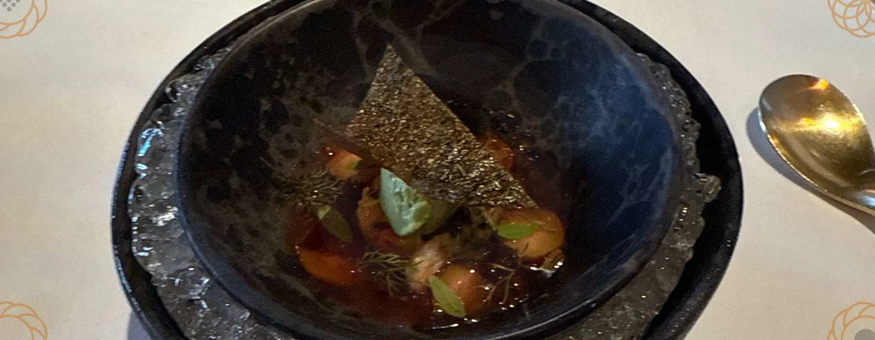 - Cornish Bluefin Otoro: Datterini domates, siyah susam, damson eriği, Avustralya kara trüfü. Otoro’nun yağlı dokusu, domatesin asidiyle temizleniyor; trüf ve susam, tabağa toprak-umami dengesi ekliyor. Bu tabakta Graham’ın Japon minimalizmini Fransız zarafetiyle birleştirdiği görülüyor. Her lokma sade ama derin — teknik değil, düşünsel bir yoğunluk var.